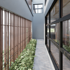 道路とLDKの間に格子を設け目隠しとしながら、いづれクレマチスなどの花の咲く植物が格子に絡み室内からも緑が楽しめる住宅とした。